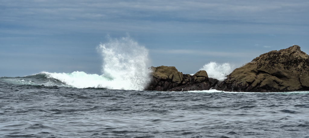 La Malouine, premier pilier d’une chaîne de récifs monumentaux.Affleurantes à marée basse, invisibles à marée haute, ces roches étaient surnommées « casse-coque », « coupe-quille » par les marins.Un géant de pierre au royaume des titans rocheux.Quand les récifs propulsent la houle… – Crédit photo Laurent Lelarge.… les vagues se dressent en murs d’eau redoutables. Crédit photo : Dominique Cardinal.