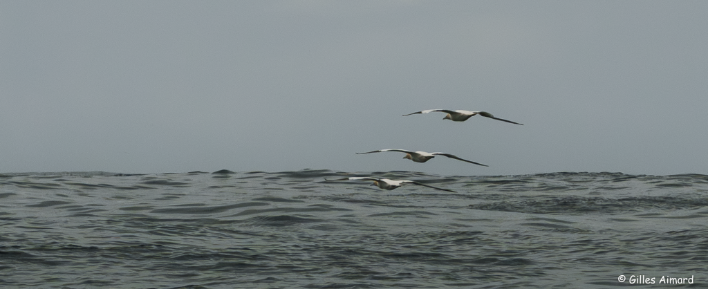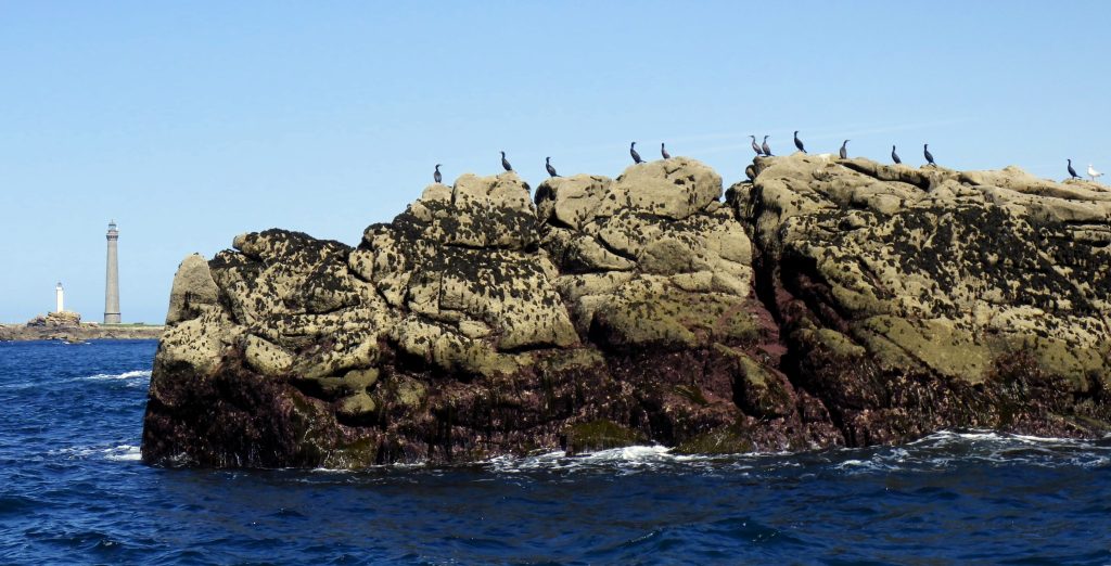 Escadre de fous de Bassan en vol vers Ouessant. Formation tendue, vol rasant, une chorégraphie aussi esthétique qu’efficace. Crédit photo Gilles Aimard.Huitriers pie en pause commérage sur les récifs de la Pendante.Cormorans dans leur fief des récifs du Lezenn.De retour d’une partie de pêche, le maître des lieux prend une « position en étendard » pour sécher sa cape noire. Crédit photo Gilles Aimard.