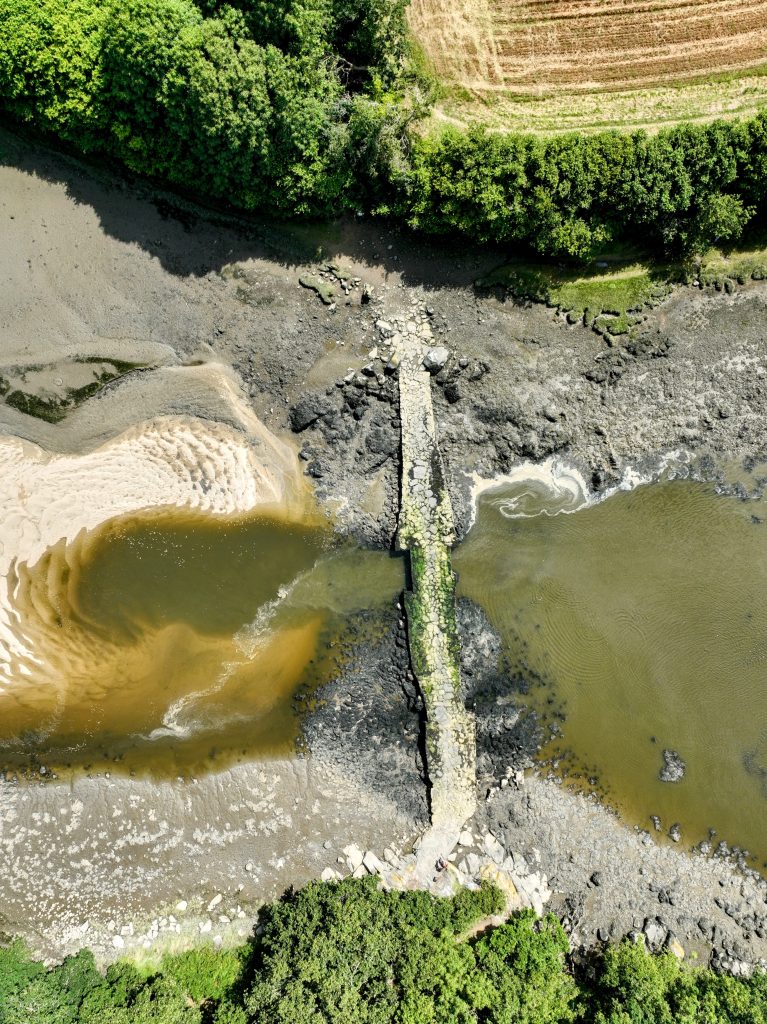 Le trait sombre qui se devine sous l’eau est un gored. Ces murs de pierre érigés il y a 7 000 ans étaient le principal système de pêche du Néolithique. À marée descendante, ils retenaient les poissons entrés à marée haute.